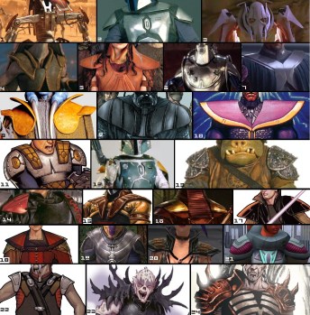 Droideka, Jango Fett, Grievous; Roos Tarpals, Unidentified spellsayer tramper, Wat Tambor, Bail Organa; Mas Amedda, Darth Vader, Xizor; Dash Rendar, Boba Fett, Gammorean; Jerec, Gorc, Imperial Sentinel, Kam Solusar; Brakiss, Desann, Tavion Axmis, Alora; Droma, the Yuuzhan Vong, Darth Krayt.
