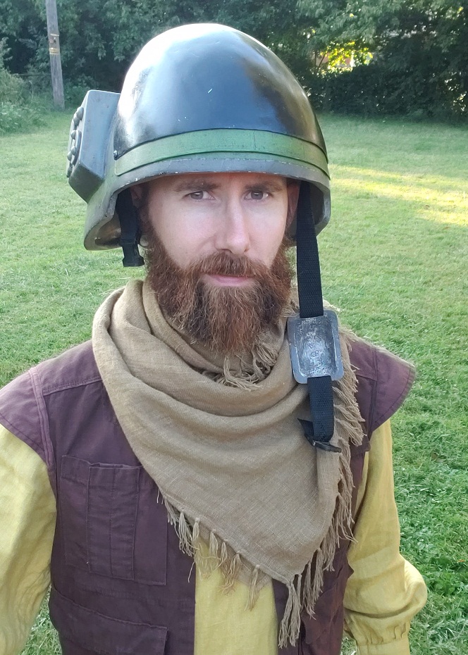 The flightsuit in question is my old tan standby from Wampawear – originally purchased for a hypothetical New Republic Archeological Corps shovel bum impression. That may have fizzled out, but the elements I initially gathered for it are as solid as ever. All the weathering you see is 100% honest and natural: every time over the last 4 or 5 years when I’ve had to work on my car (oil changes, brakes, pushing out dents, lug stud swaps, etc.) I’ve worn this flightsuit, and in the process have built up a really impressive pattern of real wear in authentic places. In person it’s absolutely filthy looking, but on camera it just reads as extra well-used. I hesitate to wash it because I’m so pleased with the patina but I’m also aware that doing so would probably be good for the garment. If I do, it will likely just be handwashed with little (if any) detergent.