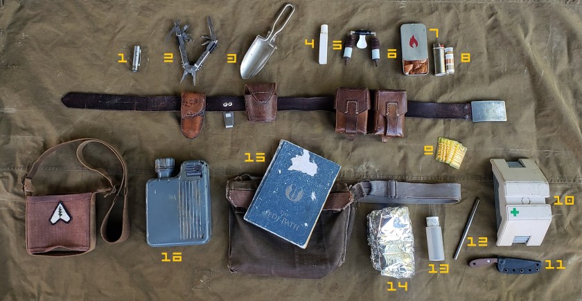 The basic needs can be covered by a belt kit which holds the necessary tools, a canteen for hydration, and a satchel (M9A1) for a couple larger items.
